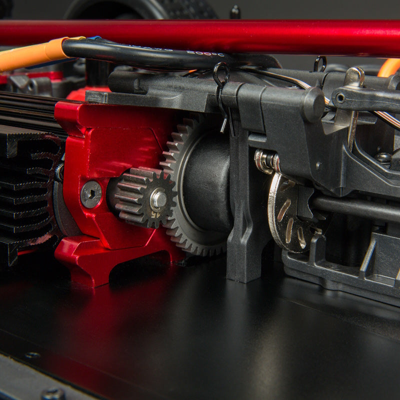 Underneath those streamlined Street Bash looks is a chassis which proves to the world, once again, that ARRMA® builds the most durable bashers. The 6061-T6 anodized aluminum chassis houses a heavy-duty drivetrain with steel driveshafts, plus all-metal diff outdrives and gearbox internals. Updated internal gears feature a new tooth profile for increased strength. A lower internal gear ratio reduces the center line transmission RPM, reducing the center drive shaft resonance and increasing drivetrain durability. Chassis toughness is reinforced with a center brace. Bearings are rubber-shielded, and the adjustable, oil-filled, anodized aluminum shocks are mounted on strong, black-anodized aluminum shock towers.