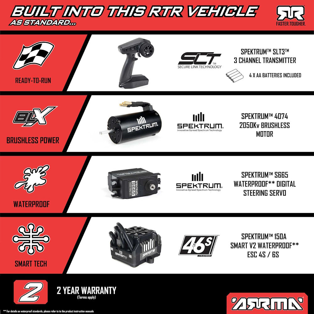 With its 6S-capable Spektrum brushless system, you can send the KRATON 6S BLX 4X4 racing and leaping at incredible 65+ mph real speeds. Components include a Firma 150A Smart V2 ESC with new, more powerful firmware, a Firma 2050Kv brushless motor, and reliable, steel geared S665 steering servo. The electronics are waterproof so you can blast without worry in any conditions - even mud or snow.