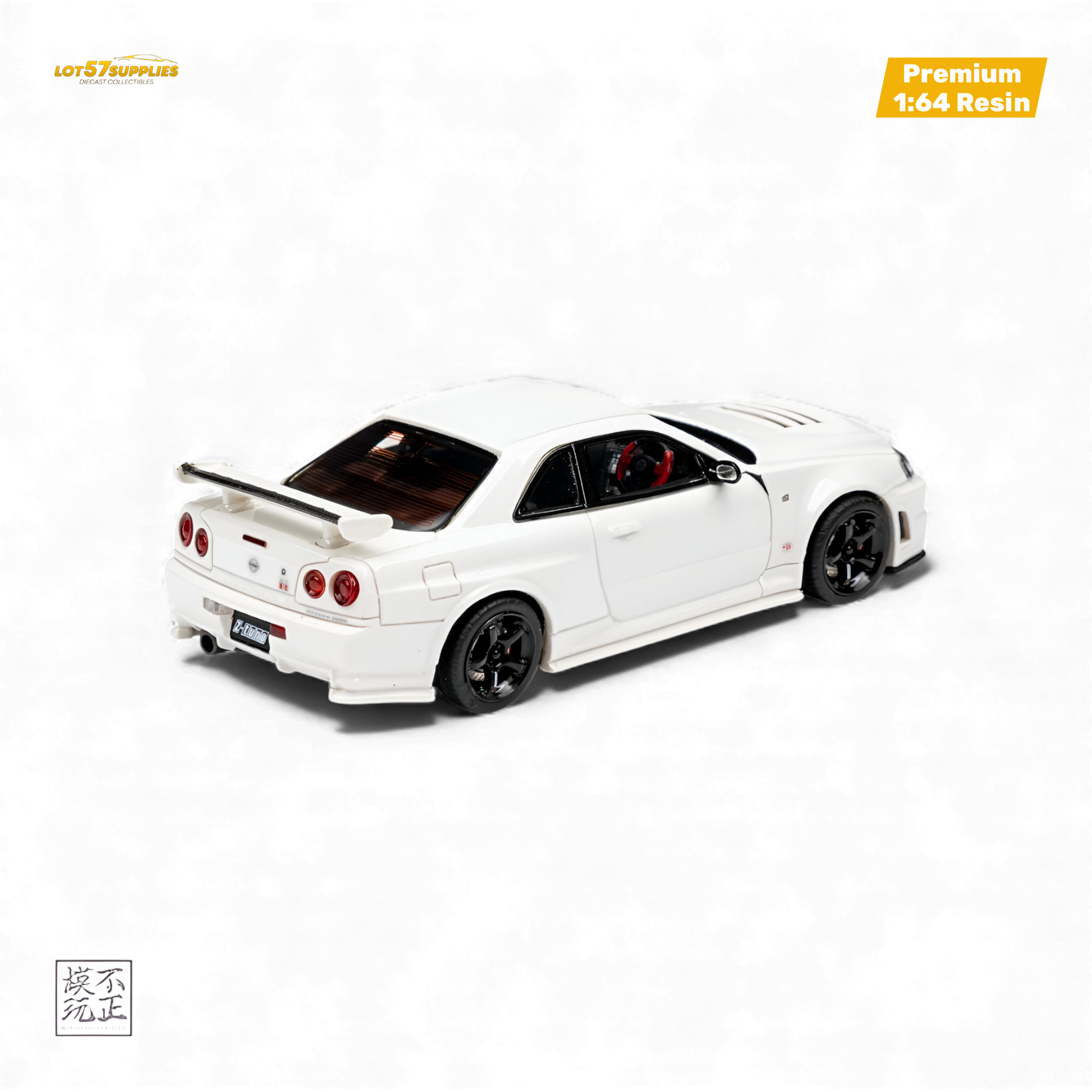 Premium resin model from Cars'Lounge featuring the Nissan Skyline GT-R R34 NISMO Z-TUNE in clean Pearl White. This highly detailed 1:64 scale collectible replicates the ultimate R34 transformation with authentic Z-TUNE widebody, upgraded aero, and race-bred styling. Limited to just 399 pieces worldwide.