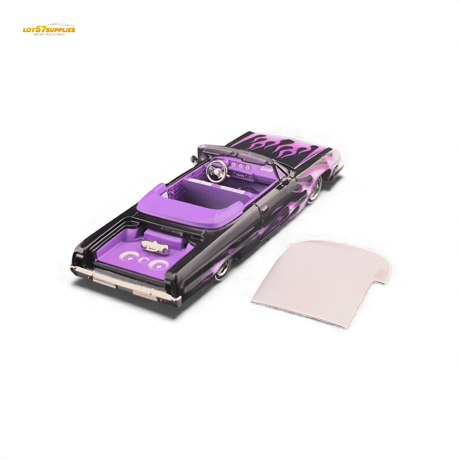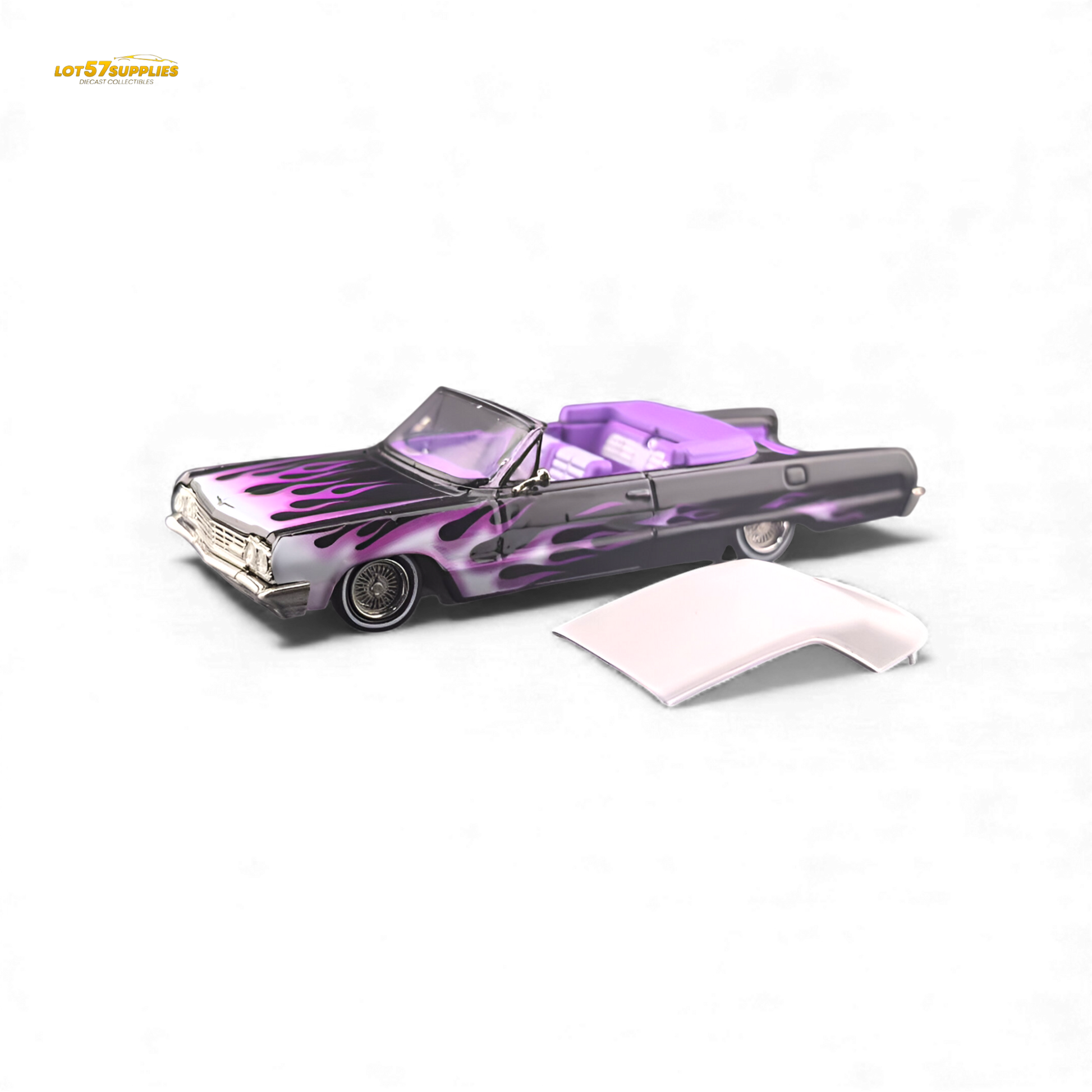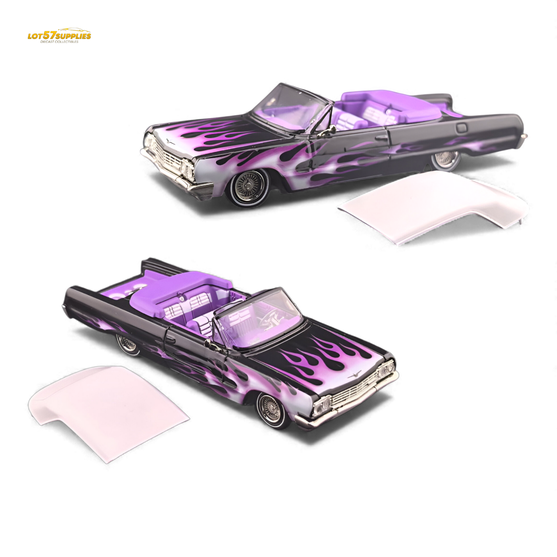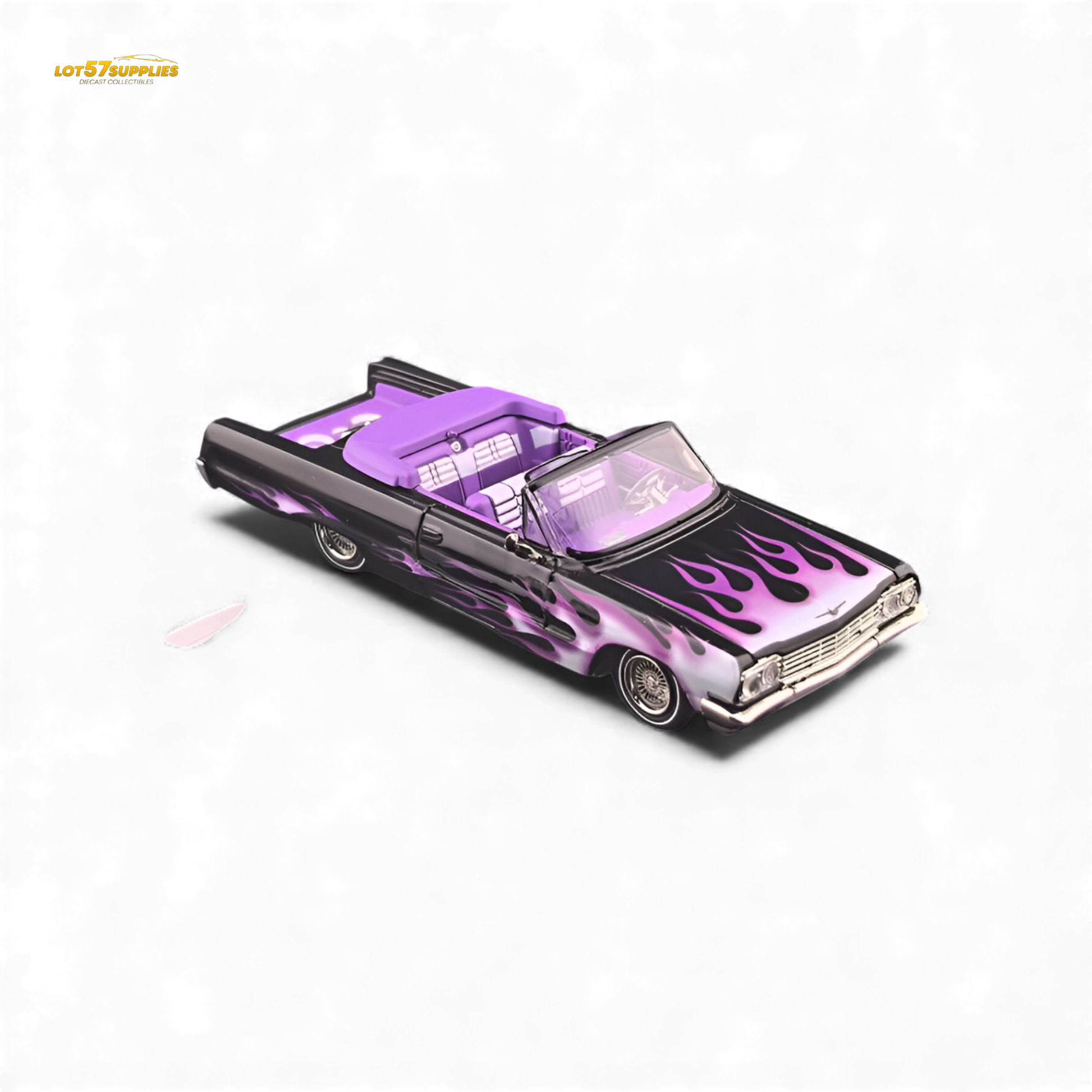 The Fine Works64 Chevrolet Impala with Ghost Flame graphics brings legendary lowrider styling to life. This ordinary version includes opening hood and trunk, a removable hardtop convertible, and adjustable chassis for perfect stance customization. Limited to 999 pieces worldwide, this model features subtle yet striking ghost flame detailing that captures the spirit of West Coast cruising culture.