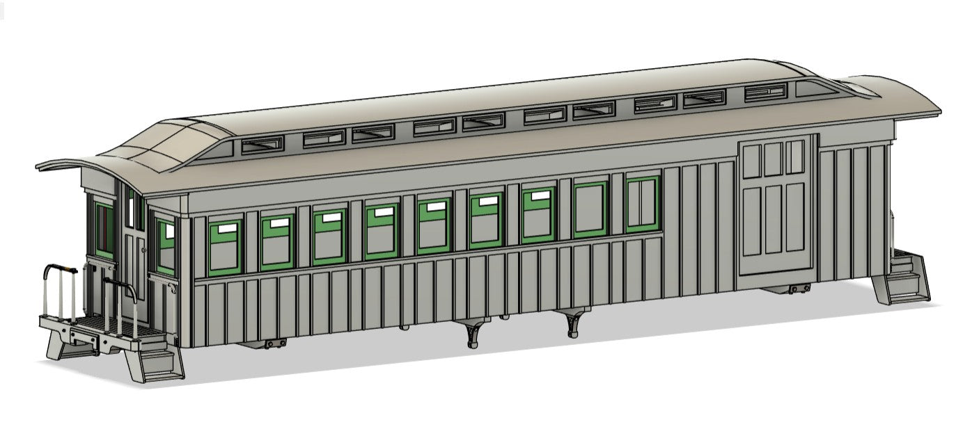 On30/0n3 38ft 1870s-1880s Carter Brothers Board and Batten style combine. It is available with the inner window frames printed with the shell or with separate laser-cut 0.02 thick inner window frames (show in in green). DXF files for the window frame inserts will be available for download, but you will need to find your own source for cutting them. For the window frames the combine uses two 5-window frames (SJP.BnBwindows-5.dxf) and four end window frames (SJP.BnBwindows-end.dxf)