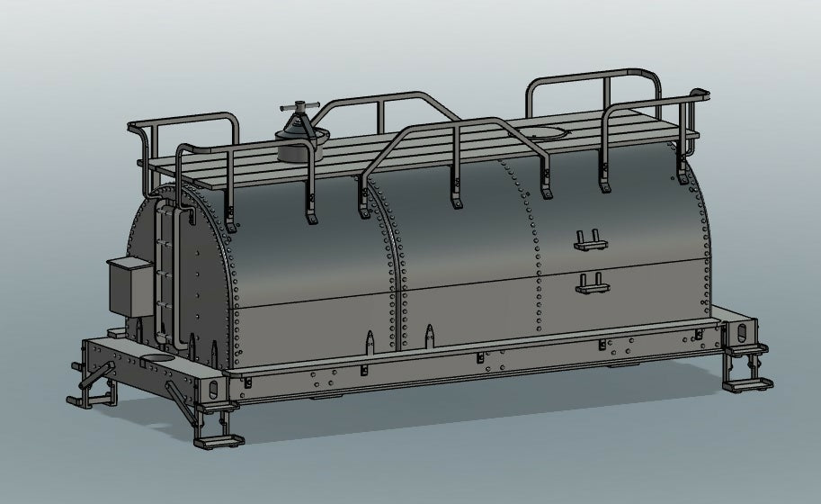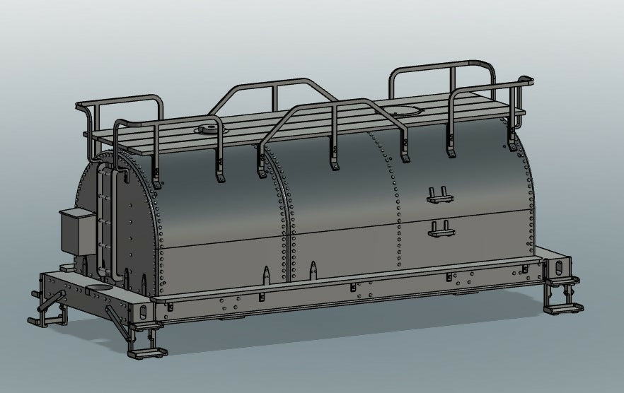 This is an On30 20ft "whaleback" tender for the San Juan Pacific cab-forward conversion kit. It is designed to use Bachmann On30 Vulcan style trucks. It could also be used for other locos but would need a different oil hatch. Image is shown with an SJP Ax-19 hatch or a Wiseman brass "SP" oil tank hatch cab be used for a cab-forward.
