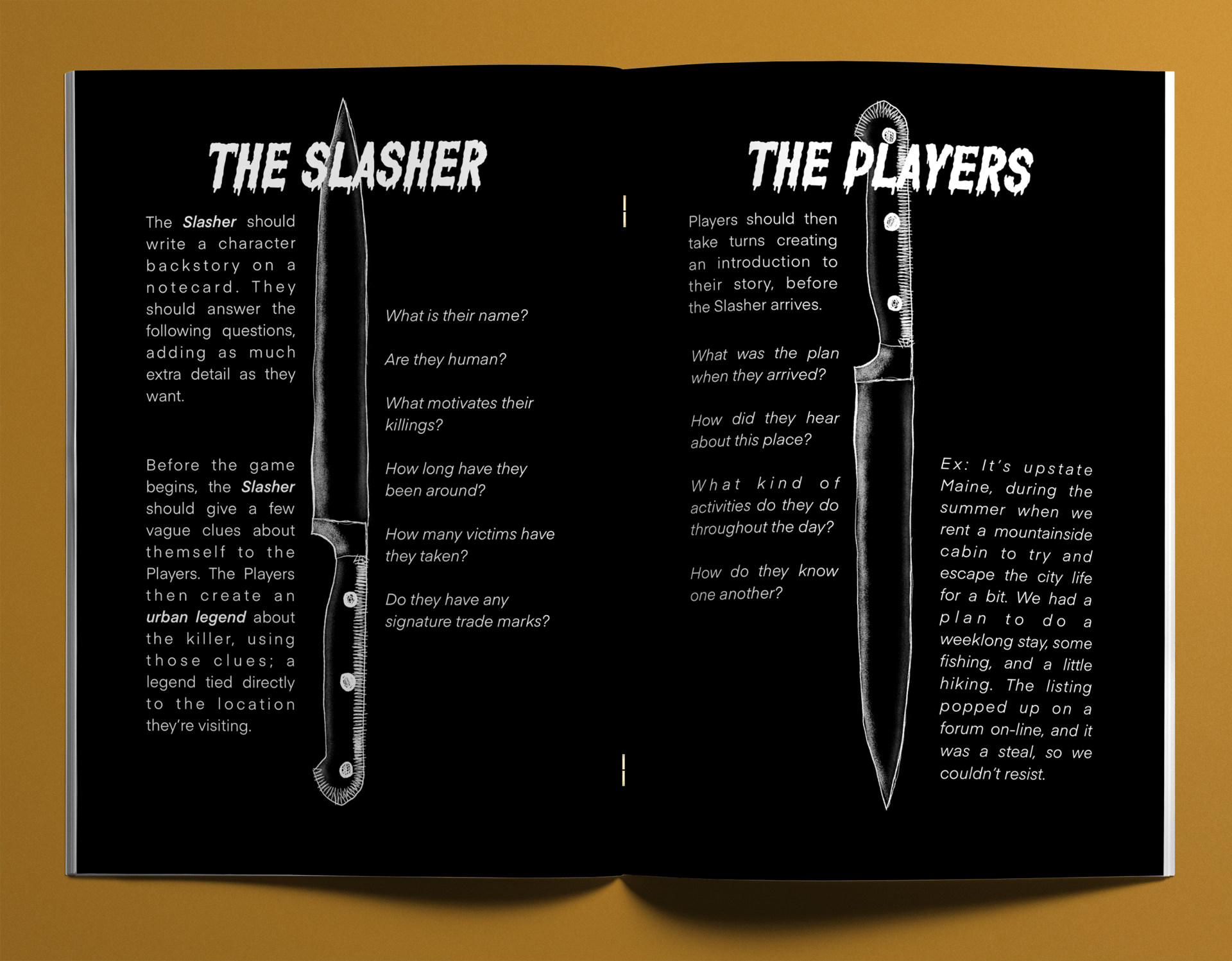 Slasher is inspired by classic films of the 80s, and includes tools to help your table tell their own horror story! One player takes on the role of Slasher, the other the innocent Teenagers.