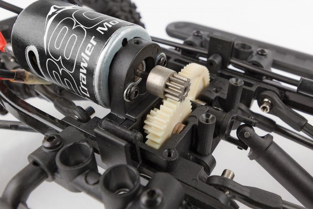 Designed not only for scale looks with realistic wheels, tires and a licensed Ford F-150 Pick-Up body, the CR12 is built for performance as well. The steel ladder frame chassis provides the perfect backbone for this rugged little rig. The 4-link suspension, threaded shocks, and soft rubber tires give the grip and performance needed to climb over the roughest terrain. Transferring power to the rocks is a compact 3-gear transmission, front steel CVA axles, and includes metal-shield ball bearings.
