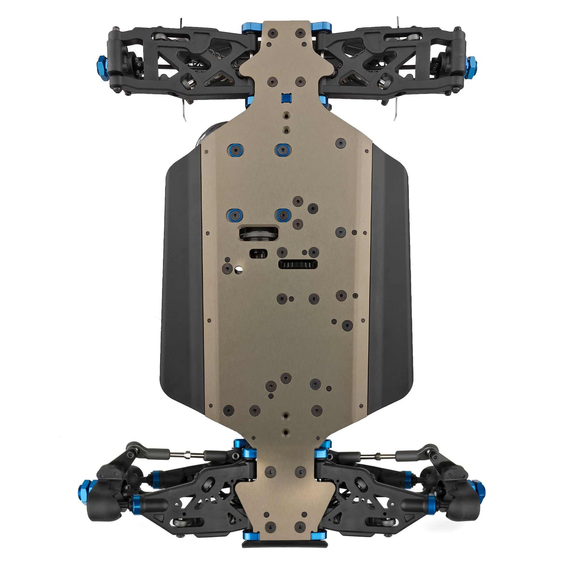 RC8B4.1 RWB chassis and side guards with tapered chassis design to increase stiffness and predictability